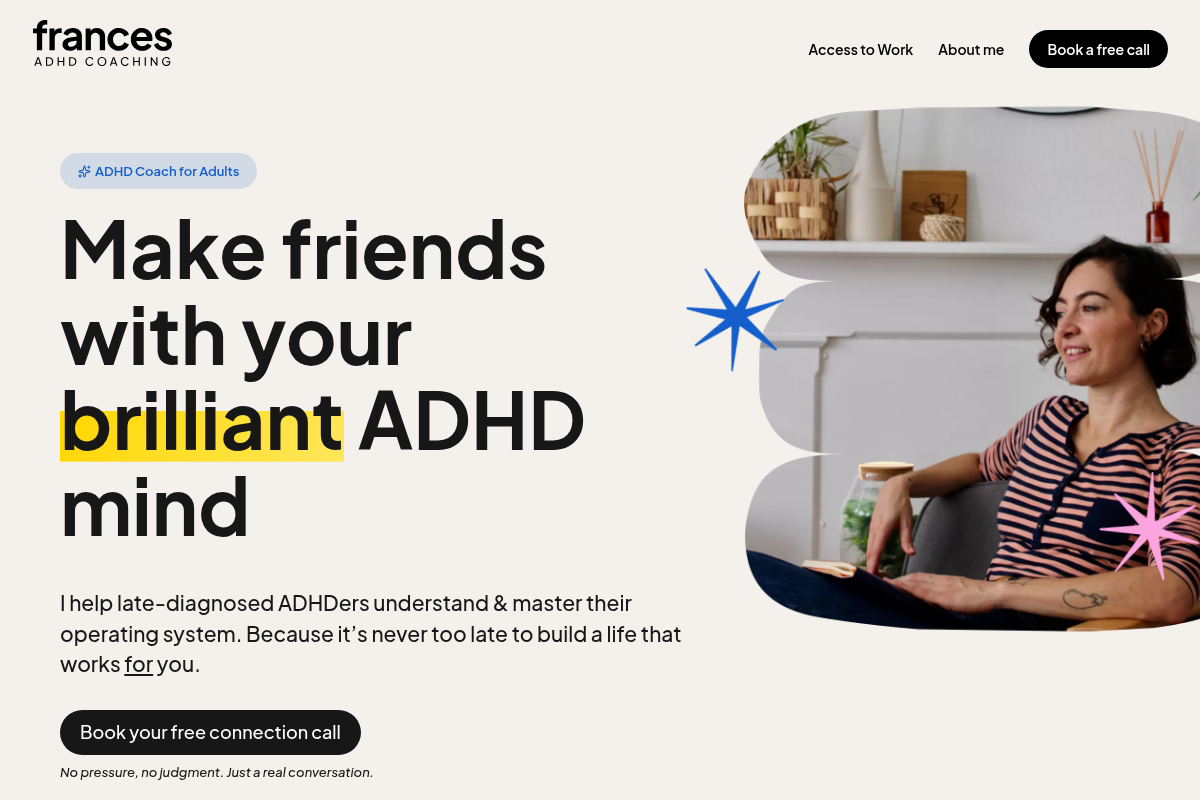 | Frances Holder ADHD Coaching | Late-diagnosed adults needing holistic, integrated support. | |