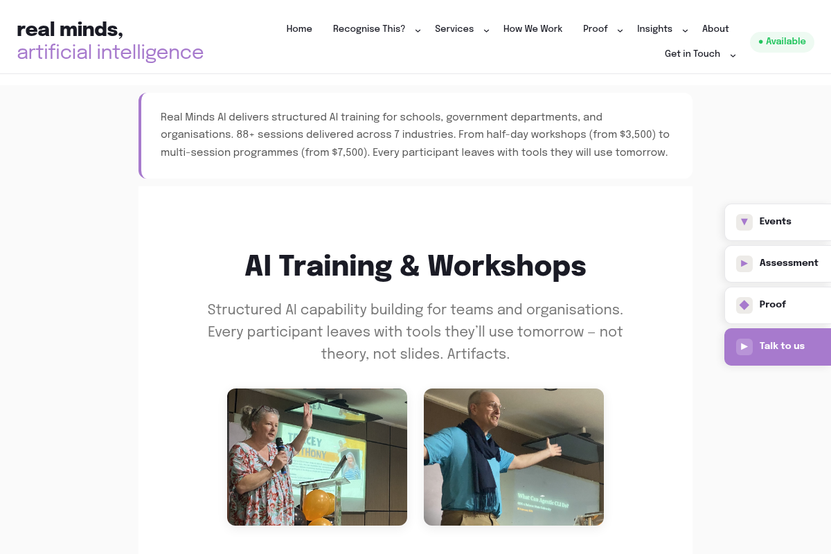 Real Minds AI focuses on 'tools you will use tomorrow.' They specialize in structured capability building for schools, government, and mid-sized organisations. Their workshops are strictly hands-on. Every participant walks away with a tangible artifact they built during the session.