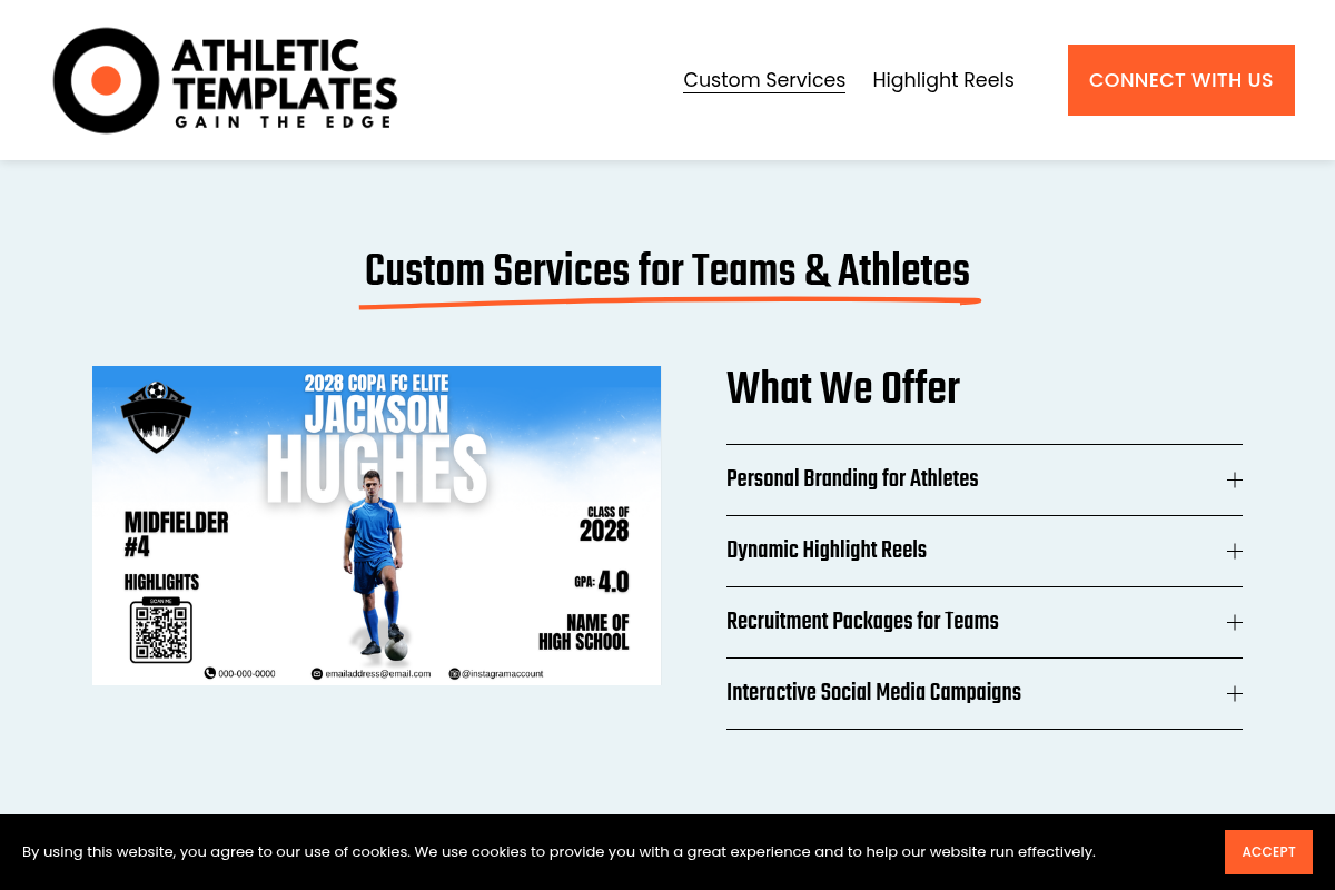 Athletic Templates provides a DIY-focused approach to athlete branding, offering high-quality, customizable graphics and website templates. Their resources are designed to help athletes and teams save time while still maintaining a professional aesthetic in their marketing. They bridge the gap between expensive custom development and generic profile pages. It is perfect for the resourceful athlete who wants control over the design process.