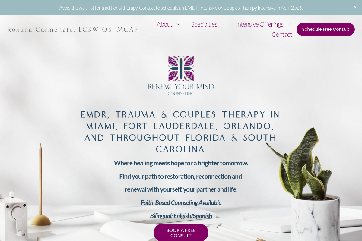 Founded by Roxana Carmenate, this practice specializes in intense trauma recovery and complex couples therapy. They utilize advanced modalities like EMDR and trauma intensives to help clients achieve faster results. Renew Your Mind Counseling is particularly effective for those stuck in long-term patterns of distress. Their work is highly regarded for being compassionate yet structured. They serve Florida and South Carolina with a bilingual, faith-welcoming approach.