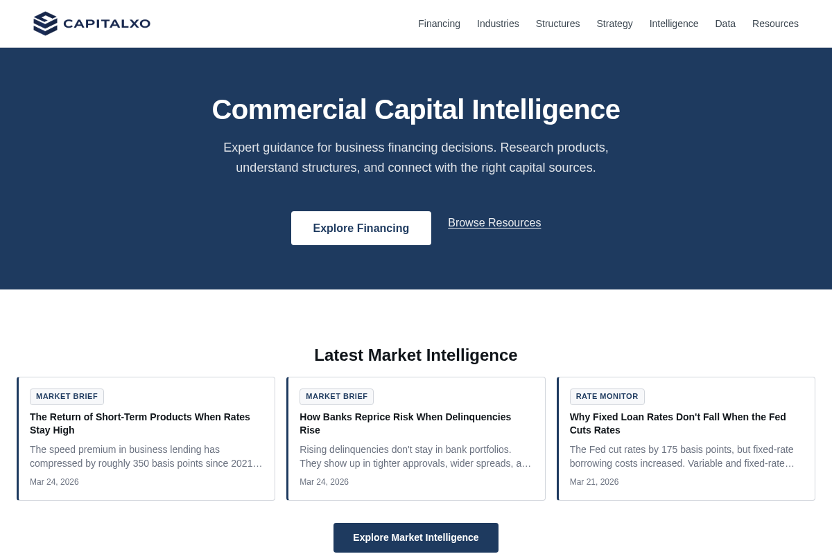 CapitalXO is the definitive data-driven resource for those who need to understand the 'spread that matters' between benchmark rates and actual borrower costs. Their platform excels at providing market intelligence on credit box trends and small business loan delinquency data. They offer a comprehensive suite of resources covering capital stack architecture and risk mitigation for commercial financing. This is the spot for professionals who need canonical reference datasets and strategic guidance on sequencing growth capital.
