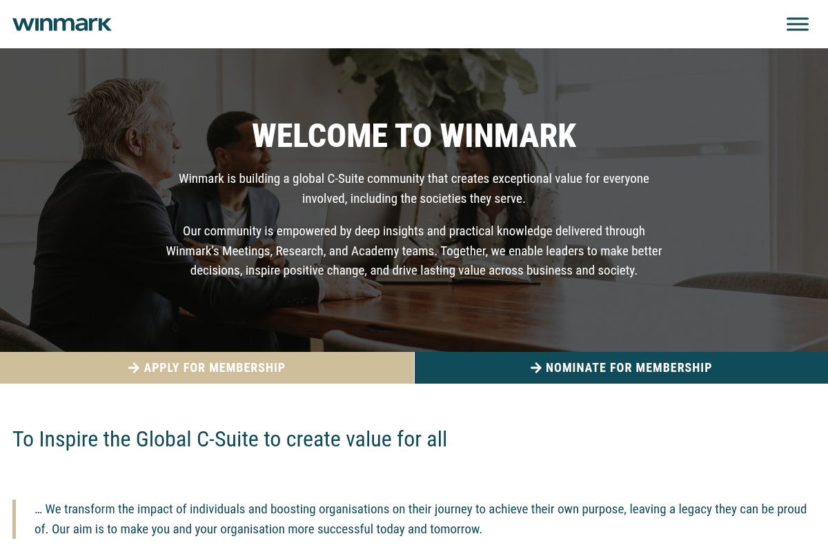 Winmark Global is a premium C-Suite community that excels at transforming individual impact into a lasting corporate legacy. Led by John Jeffcock, the platform integrates expert-led networking with deep-dive research programs tailored for senior executives across several disciplines. You gain access to a environment where leadership development is not just a concept, but a structured journey supported by regular events and specialized workshops. Their focus is on making you more successful both today and tomorrow by bridging the gap between current operations and future strategy. The network is particularly strong for those looking to influence their organization's purpose moving forward.