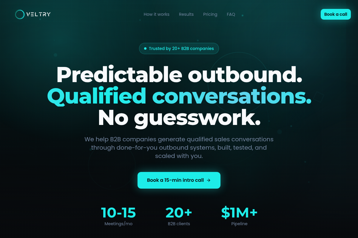 Veltry focuses on a 'GTM Flywheel' approach that prioritizes signal-based list building over static databases. They use AI validation to ensure every lead is a high-fit prospect before any outreach occurs. As noted on their official platform, they utilize a unique 50/50 risk-aligned pricing model that ties part of their fee to performance. This creates a transparent partnership where the agency is incentivized to book qualified conversations rather than just send emails.