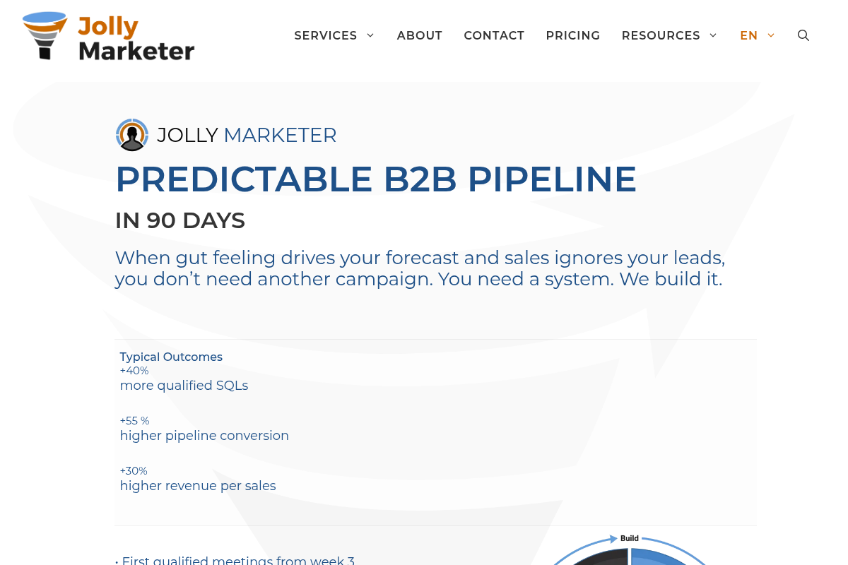 Jolly Marketer approaches GTM through the lens of 'Revenue Architecture' and RevOps integration. They specialize in fixing the system leaks where sales and marketing misalignment typically costs money. Case studies highlight significant increases in SQLs and pipeline conversion by restructuring the CRM and lead flow. They focus on building long-term systems at Microsoft or IBM levels for mid-market players.