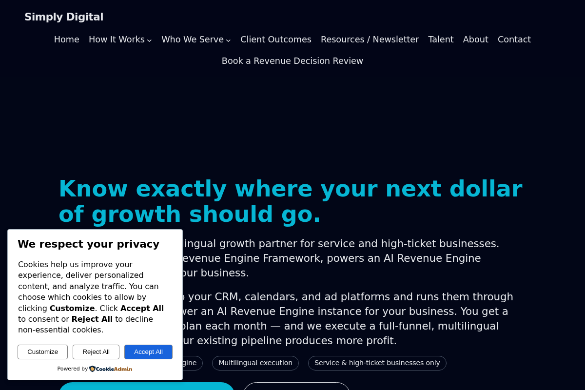 Simply Digital provides a unique solution for US-based brands looking to penetrate or scale within Spanish-speaking communities. They plug directly into your existing business architecture, providing native Spanish-speaking pods to manage intake, setters, and follow-up. This isn't just translation; it is a full-stack integration that treats the Spanish market as a dedicated P&L vector. They help businesses achieve the same unit economics in Spanish that they enjoy in English. Their focus is on creating booked work and revenue, not just clicks.