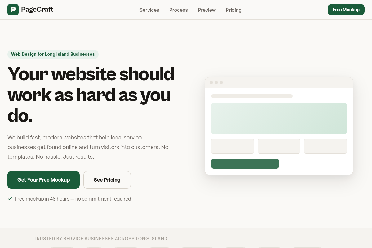 PageCraft is changing the game for Long Island service businesses by removing the high barrier to entry. They offer a unique 48-hour free mockup service that allows you to see your site before you spend a dime. Their focus is strictly on conversion, ensuring every element guides visitors toward a call or booking. With a starting price under $500, they provide an enterprise-grade look for small business budgets. They also handle the heavy lifting with ongoing maintenance and SEO-ready frameworks. The results are fast, mobile-friendly sites that actually perform.