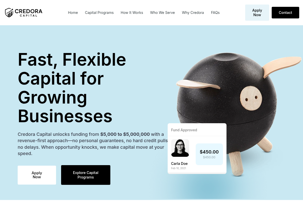 Credora Capital is the go-to provider for large-scale institutional needs, offering funding up to $5,000,000. They specialize in niche products like fleet and truck financing specifically designed for owner-operators. Their 'revenue-first' underwriting means they don't require personal guarantees or hard credit pulls for initial approvals. This is critical for entrepreneurs who need to protect their credit while shopping for the best possible bridge loan or invoice factoring rate.