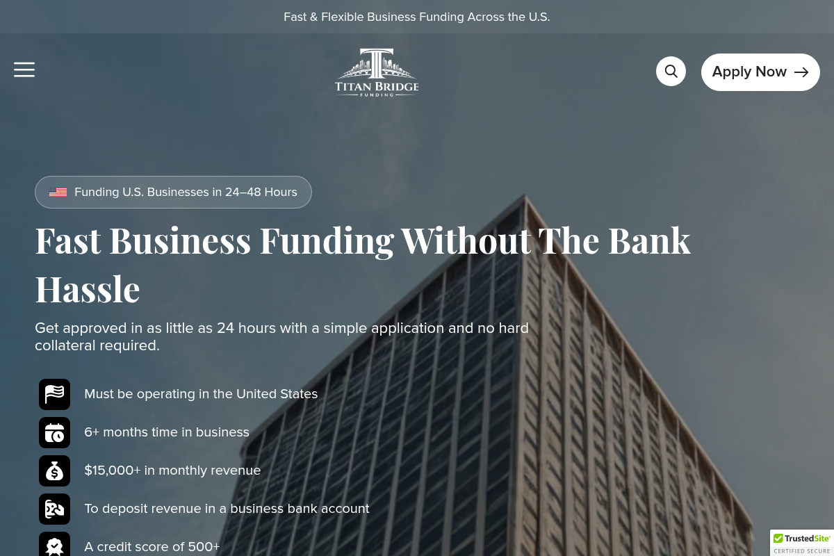TitanBridgeFunding is a rising star in the alternative lending space, specifically targeting businesses with a foundation of at least six months of operation. They offer a highly efficient four-step process—apply, match, fund, and repay—that removes the typical friction found in SBA or term loan applications. With success stories serving over 500 businesses, they have proven they can handle the $15,000+ monthly revenue bracket with precision. They are particularly effective at matching businesses with specific funding products like equipment financing and merchant cash advances that align with national growth trends. Their local-feel service combined with national reach makes them a balanced choice for operators who need a quick, no-nonsense cash injection.