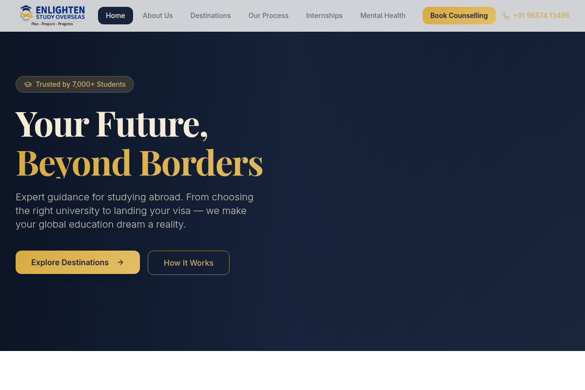 Enlighten Study Overseas offers a focused, personalized approach to international education, having guided over 7,000 students through their study abroad journeys. They specialize in simplifying the complex path of university selection, visa processing, and standardized test preparation like IELTS. Their commitment to transparency and student-centric support makes them a reliable choice for those seeking individualized attention. By combining deep domain knowledge with a step-by-step process, they ensure that every aspect of your application is handled with precision. They prioritize your long-term career goals, helping you find the perfect balance between academic fit and global opportunity.