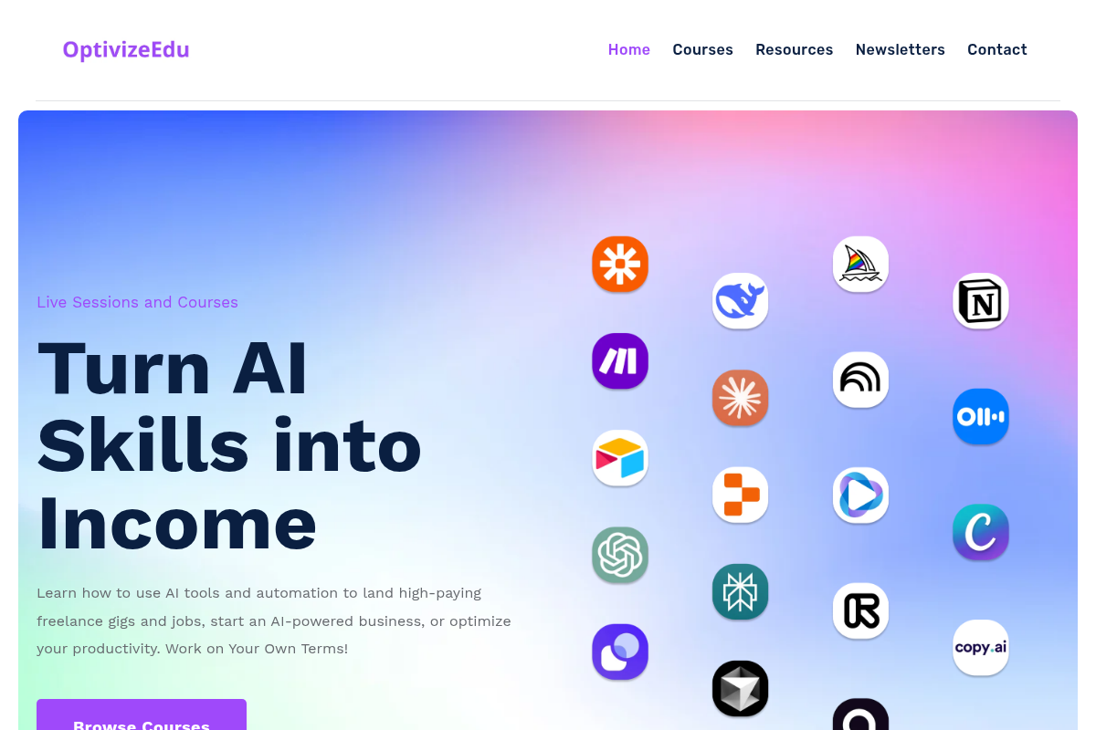 Optivize Education focuses on the intersection of AI skills and monetization, making it a great choice for freelancers, consultants, and entrepreneurs looking to create new income streams. Their curriculum is highly tactical, covering everything from building AI agents with CrewAI to automating client workflows with Zapier. If your goal is to learn the 'how-to' of specific AI tools to either improve your own business efficiency or offer AI implementation as a service to others, this is a top-tier resource.