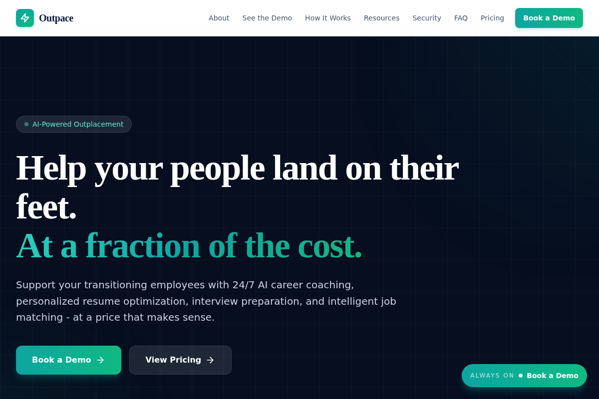 Outpace is a lean, AI-native platform designed to deliver high-quality outplacement support at a fraction of the cost of traditional firms. Their platform provides 24/7 AI-powered career coaching that allows employees to perform mock interviews, optimize resumes, and receive job matching advice instantly. By automating the most labor-intensive parts of the job search, Outpace enables companies to support every single affected employee rather than just executive tiers. This democratized approach to career transition ensures that no employee is left without resources during a layoff. It is an ideal solution for fast-growing companies looking for efficiency without sacrificing employee care.