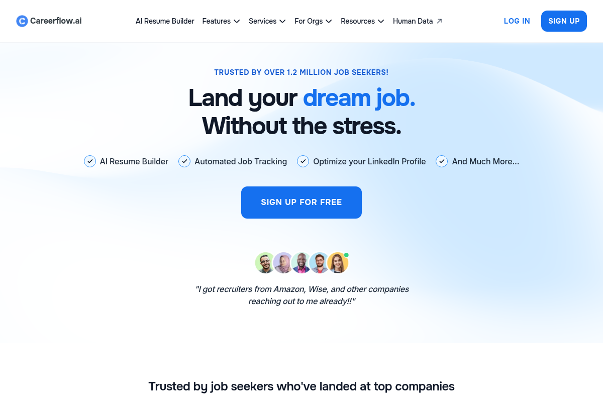 Careerflow.ai focuses on the intersection of AI-driven career growth and transition support. The platform provides comprehensive job search optimization tools that help displaced employees polish their professional brand quickly. HR managers can leverage the platform's insights to help their former employees land roles 3x faster than traditional manual methods. It offers a streamlined, user-friendly interface that appeals to younger, tech-savvy workforces. While it may lack the massive global infrastructure of larger firms, its AI-first design makes it highly effective for targeted, rapid transition support.