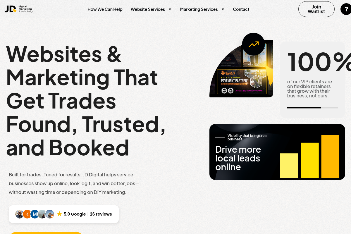 JD Digital Marketing provides scalable contractor websites and full-scale brand builds designed for long-term growth. Their Signature Site package combines brand strategy, professional copywriting, and custom web design into one structured build. They are built for established trades and service businesses that need more than a basic online presence to compete in crowded markets. Their focus is on creating a 24/7 digital salesperson that answers questions and guides customers to contact you. They are an excellent choice for businesses ready to level up their digital infrastructure.