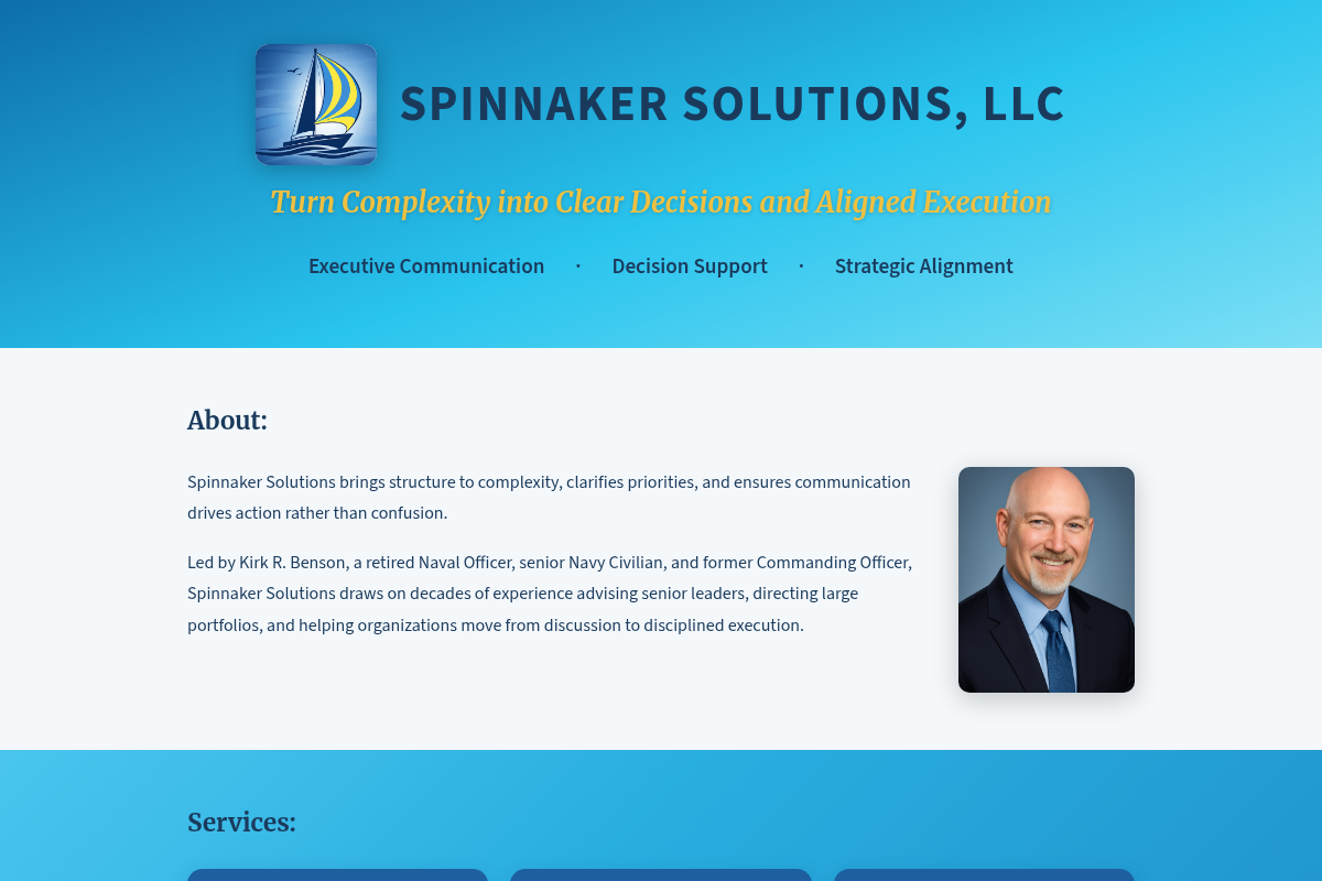 Spinnaker Solutions, LLC is a specialized consulting firm dedicated to helping senior leaders clarify complex priorities and drive disciplined execution. Led by former U.S. Navy officer Kirk R. Benson, the firm leverages practical leadership experience to provide high-stakes decision support and executive communication coaching. Their approach focuses on strategic alignment and organizational performance, specifically tailored for large portfolios. By bridging the gap between strategic intent and operational reality, they enable leaders to navigate uncertainty with precision and confidence.
