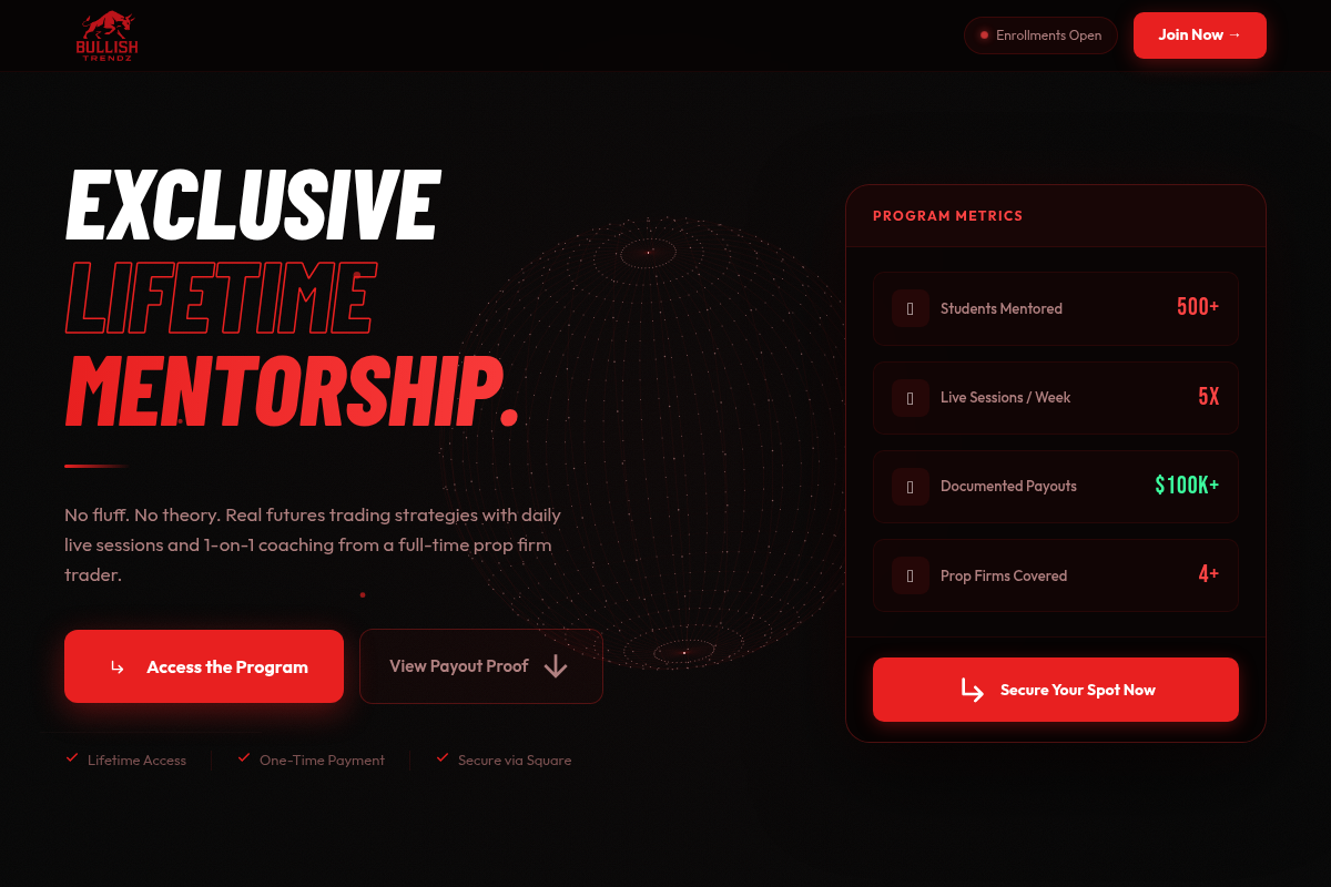 Bullish Trendz stands out by offering a no-nonsense, lifetime mentorship model that prioritizes practical execution over theoretical fluff. Led by Markus, the program provides daily live trading sessions where students observe real-time decision-making in the futures markets. With over 500 students mentored, the focus remains strictly on data-driven strategies and passing prop-firm challenges. The curriculum includes a proprietary playbook and direct 1-on-1 coaching checkpoints to address individual psychology and execution gaps. It is a highly focused environment designed for traders ready to commit to professional-grade consistency.