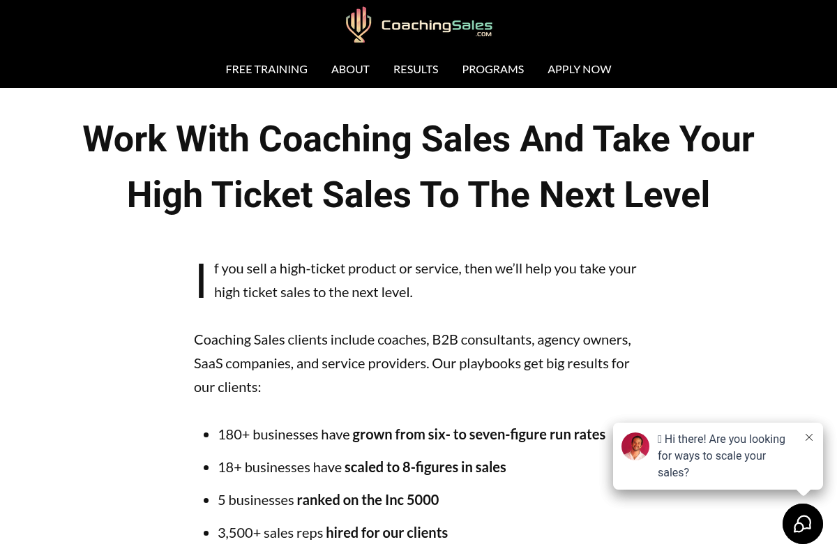 Coaching Sales specializes in the sales side of the high-ticket equation, providing playbooks and consulting for coaches, agencies, and B2B consultants. They have a massive track record, with over 180 businesses reaching six-to-seven-figure run rates. Their services include everything from sales team hiring to script refinement and CRM optimization. They excel at helping owners who already have leads but struggle to close them at premium price points. It is a top-tier choice for those looking to professionalize their sales infrastructure.