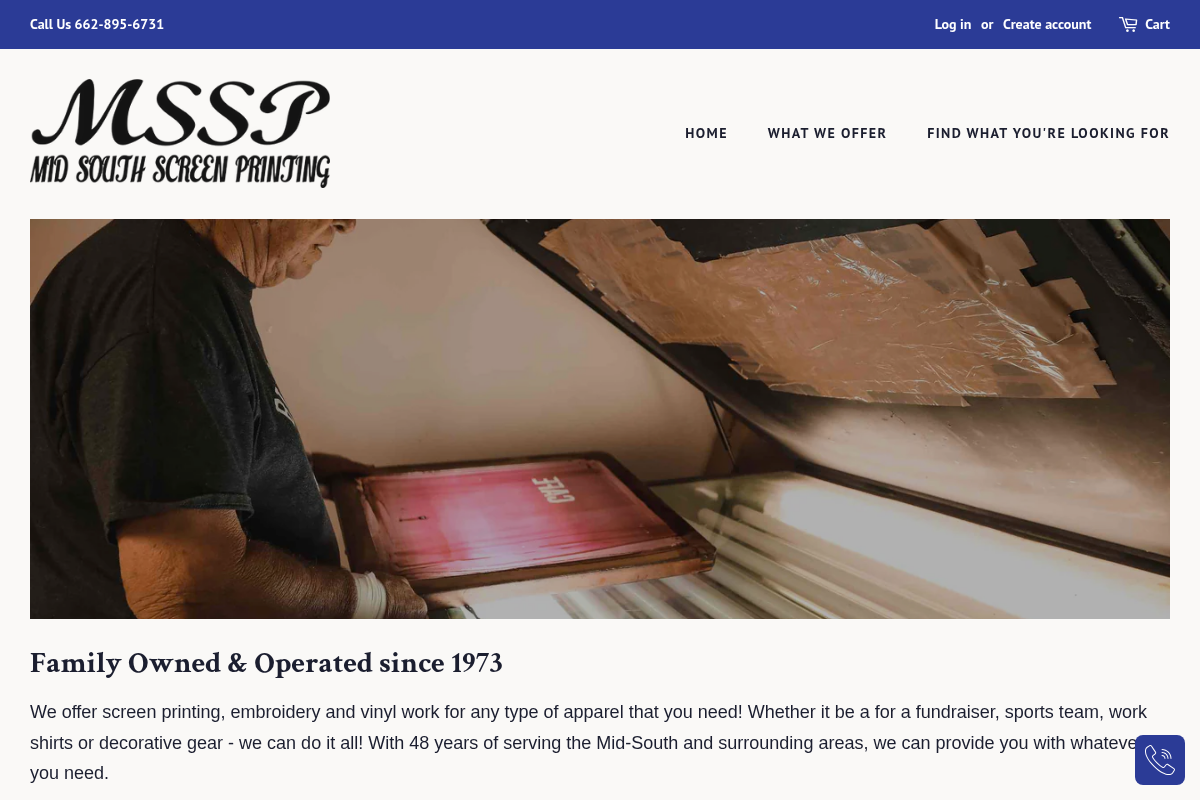 A screenshot of the Mid South Screen Printing website.