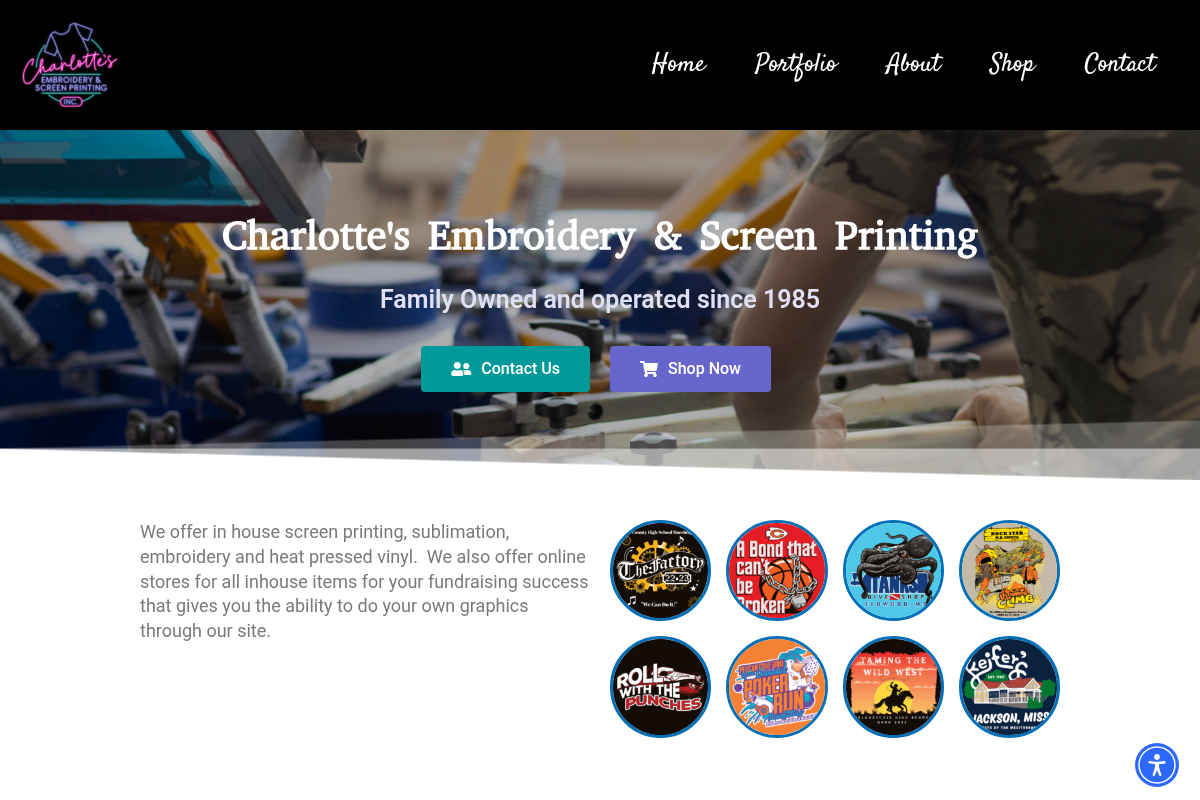 A screenshot of the Charlotte's Screen Printing website.
