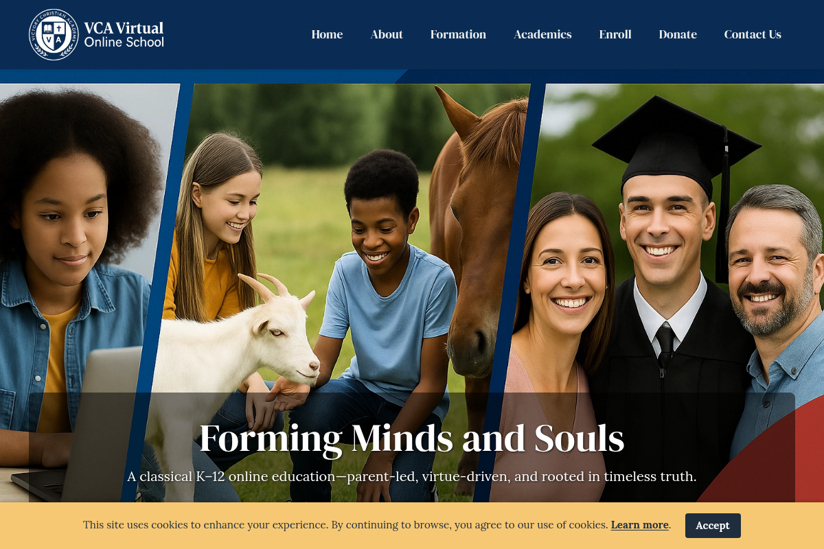 VCA Virtual provides a Christ-centered, classical K-12 education that combines academic rigor with virtue formation. Their virtual campus offers optional tutoring and academic counseling, supported by an Academic-Faith Coach who collaborates with parents. The program is designed to be flexible, supporting both full-time virtual learners and homeschooling families needing supplemental resources. They focus on forming the whole person—mind, body, and spirit—in a community-focused online environment.
